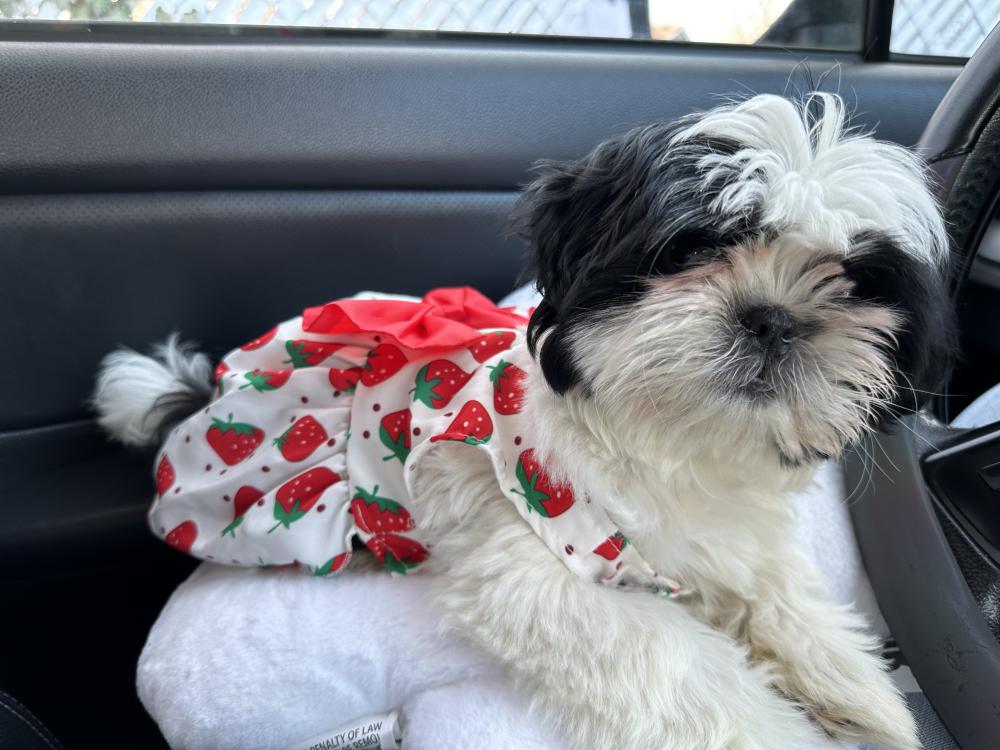 Pet Description:White and black Shih Tzu wearing a red collar. |