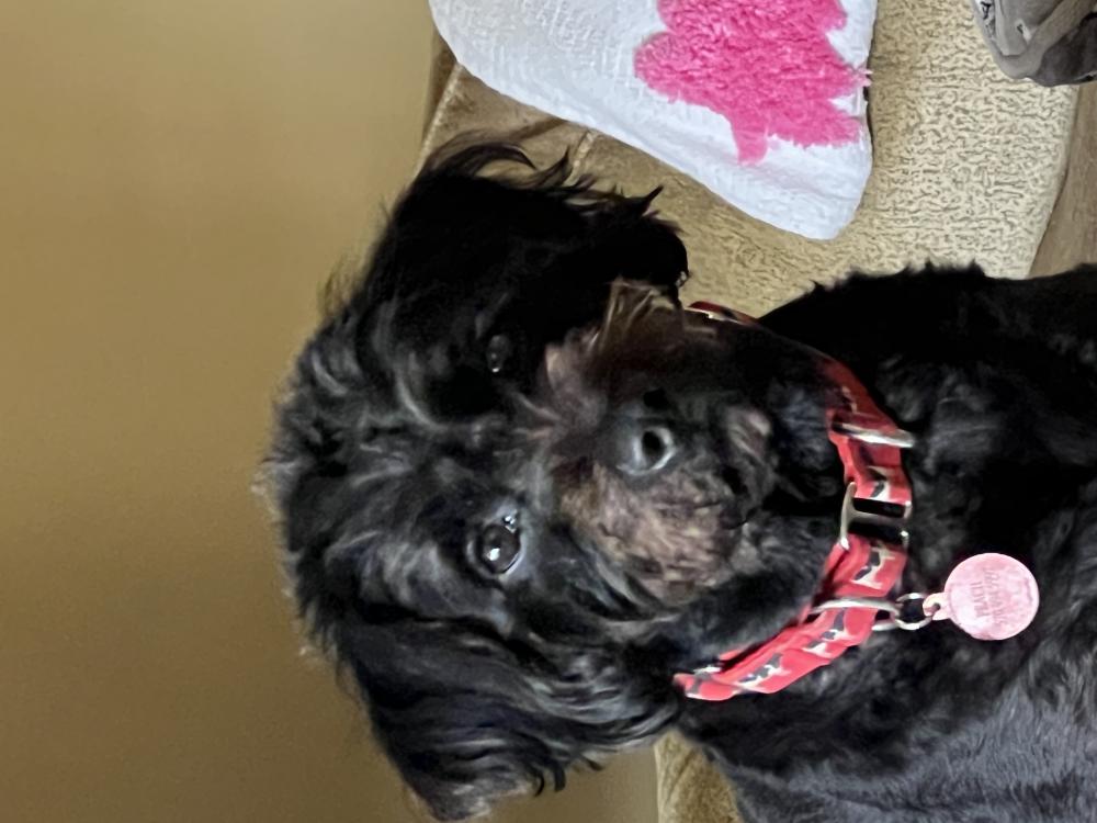 Pet Description:Medium Size, All black, about 40 pounds Purple collar Very scared Freshly groomed |