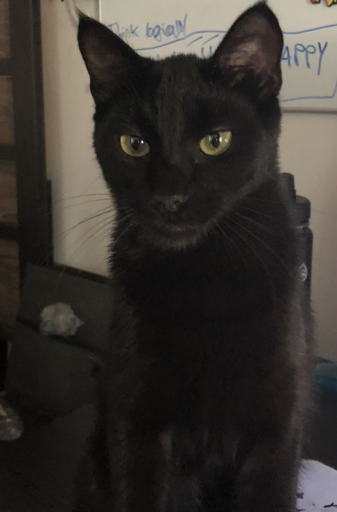 Pet Description:Black Cat, Does not like being held. 11 months, smaller than average sized cat. Yellow Eyes, Sharp Face, Skittish, Shy. |