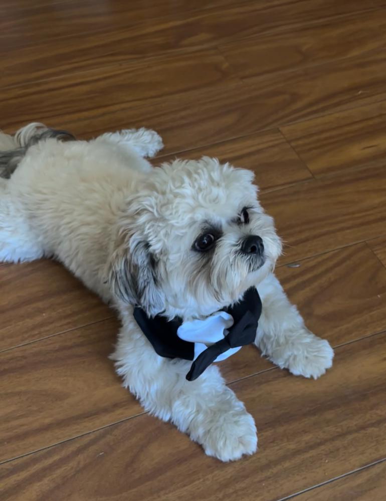 Pet Description:White Shih Tzu has some cream colored patches, some black on ears and tail. Last seen wearing a blue collar, no dog tag, and a black and white tuxedo. |