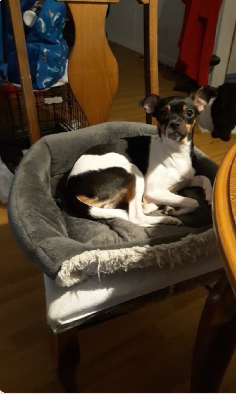 Pet Description:Rat terrier mix short hair black white and brown. Long legs and small body. Underbite and wearing a pink bowtie collar |