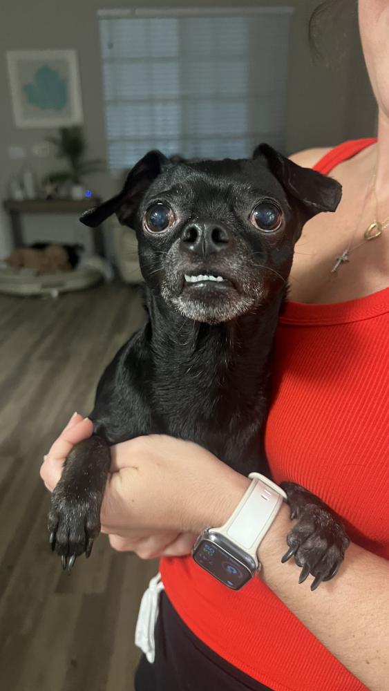Pet Description:Black Small, Chihuahua/Pug mix? Very friendly, he is missing home terribly |