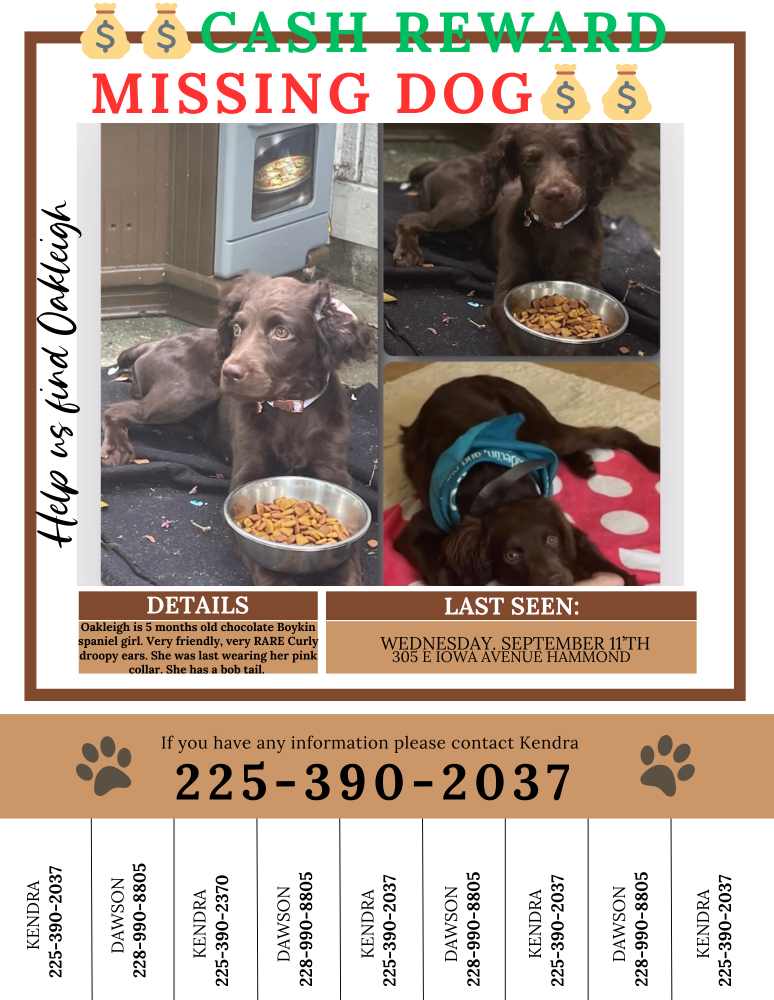 Pet Description:Chocolate Boykin spaniel, very friendly. She barks a lot especially when left alone. She has curly droopy ears and a BOB tail. SHES ONE OF A KIND. The only breed her kind in Hammond. However she could have been taken somewhere else. Last wearing her pink collar with my number on it. If you see her and think it’s her. It’s her. She’s very rare. •Cash Reward• |