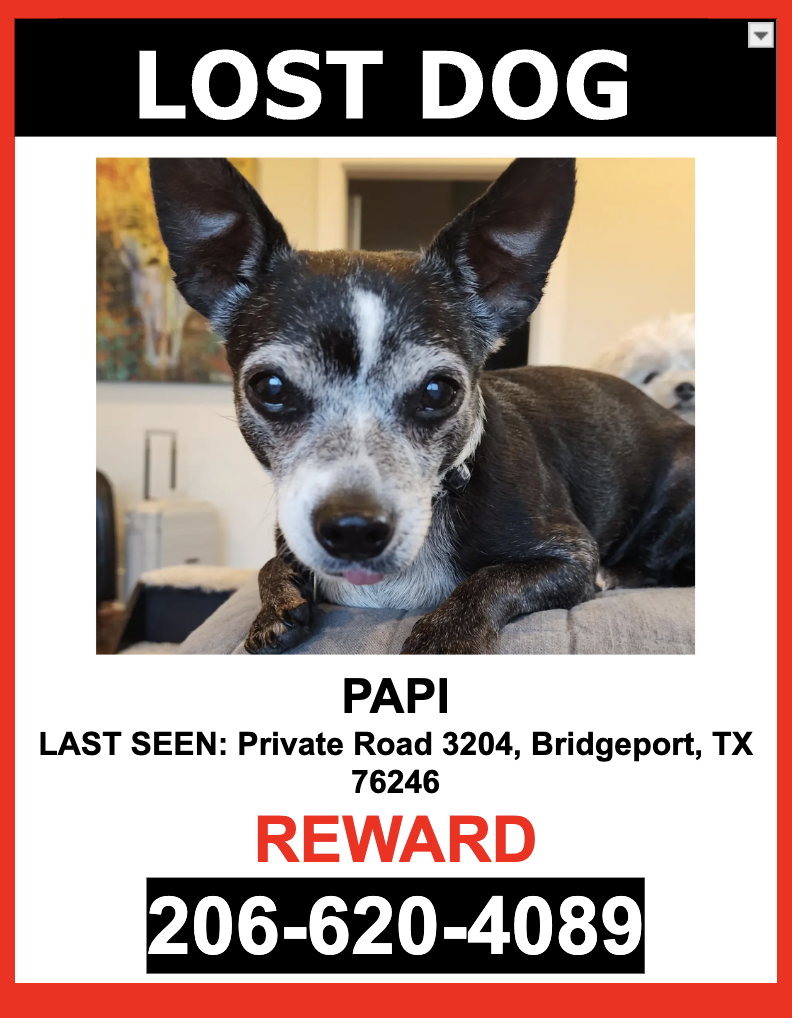 Pet Description:LOST PET - BLACK & WHITE / CHIHUAHUA / MALE - $$ Reward $$**MISSING SINCE 9/20/24 AT 9:15 PM**PAPI is a MALE, BLACK AND WHITE, CHIHUAHUA who escaped and was last seen near PRIVATE ROAD 3204.PAPI is wearing HIS COLLAR with tags.If you see PAPI please DO NOT CHASE HIM.PLEASE CALL OR TEXT ONLY.206-620-4089$$ Reward $$ |