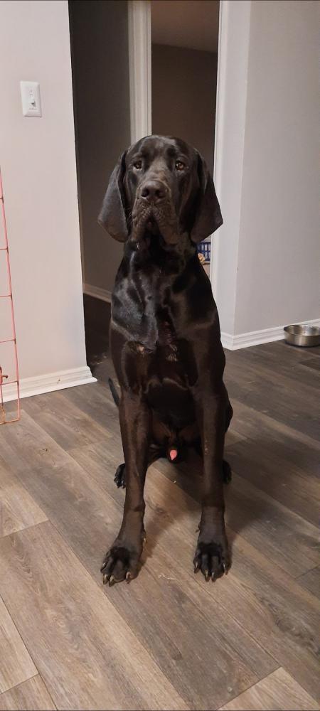 Pet Description:Solid Black With Long Hanging Ears, cone head with long nose, large frame but slim, have been Neuter. |