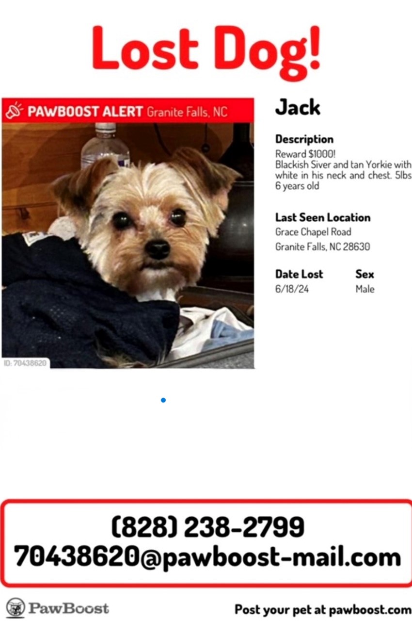 Pet Description:Jack is right at 5 lbs depending on if someone is feeding him. He is standard yorkie colors with a white strip down his chest from his chin. He loves to fetch and loves his babies, especially if they squeak. He is loving and sweet and always kissed my tears away. I need him home. He is 6 years and I have had him since he was 4 months old. I have another 14 year old yorkie that misses him dearly. |