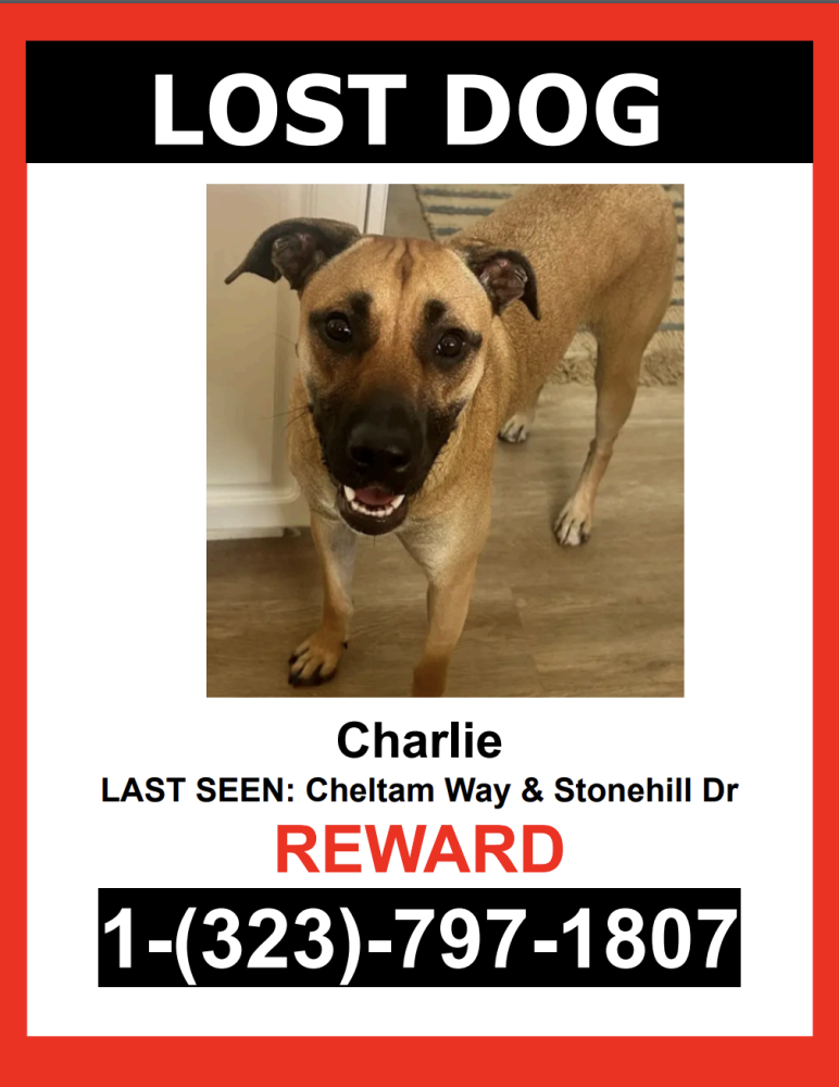 Pet Description:**MISSING SINCE 09/25 AT 9 PM**Charlie is a Female, Tan/Black ears and snoot, who escaped and was last seen near Cheltam Way & Stonehill Dr..Charlie is wearing HER SPIKED COLLAR and IS microchipped.If you see Charlie please DO NOT CHASE HER.PLEASE CALL OR TEXT ONLY.(323) -797-1807$$ Reward $$ |