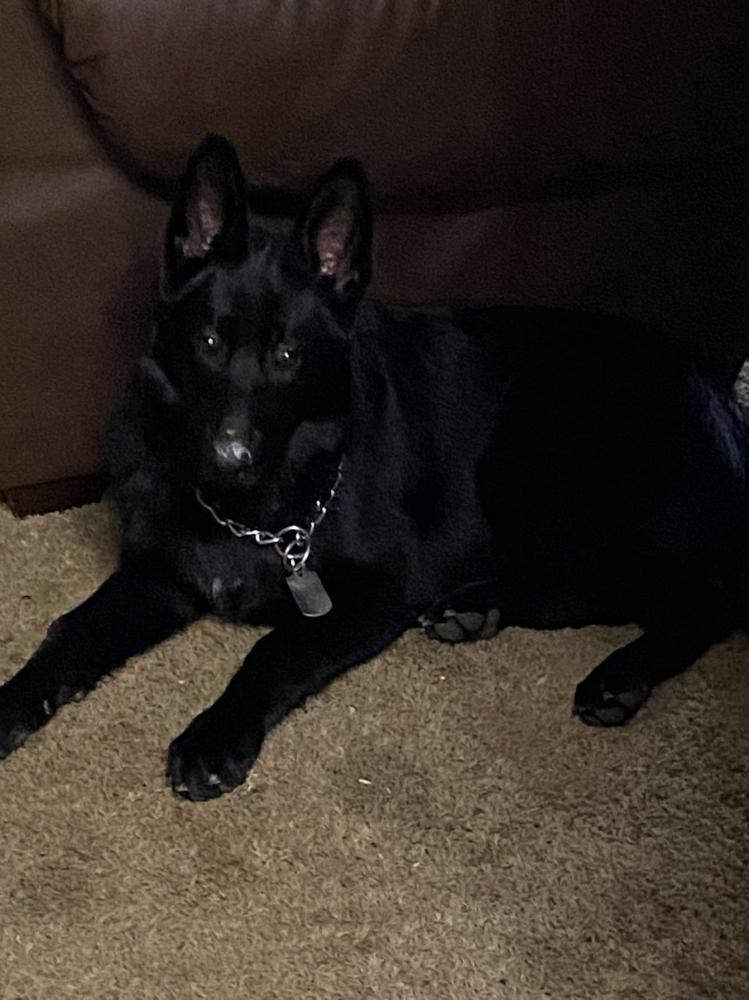 Pet Description:Black gsd eith a chain collar. Very thin and sweet. |