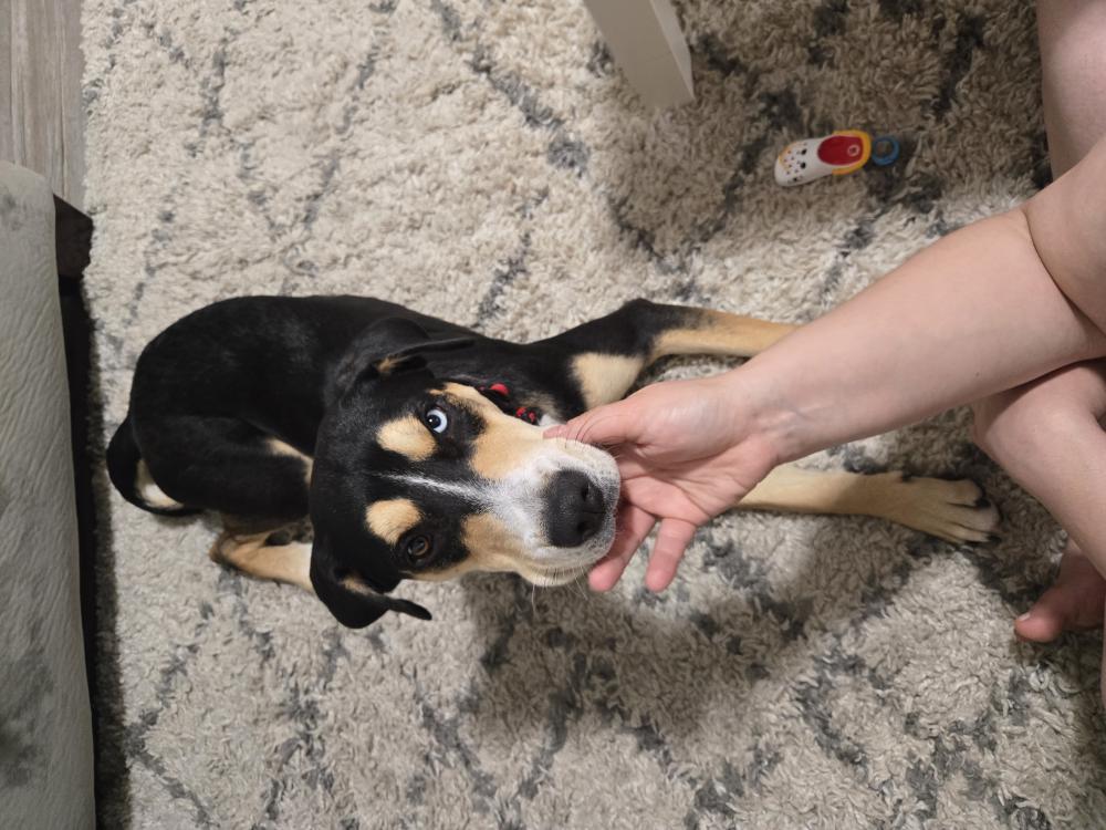 Pet Description:Husky mix short hair black white and brown color One eye blue other brown with blue on topHad a black harness and light blue leash on |