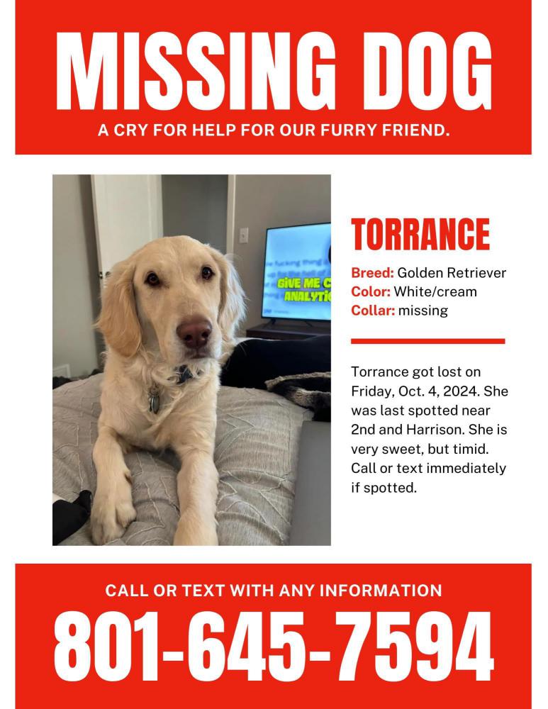 Pet Description:Torrance is a sweet but timid retriever mix. She doesn’t have her collar on and is not chipped. |