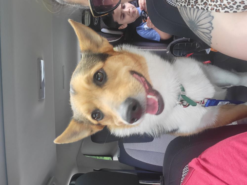 Pet Description:Brown, black, and white welsh corgi, pointed ears, short tail, small white mark on top of head. |