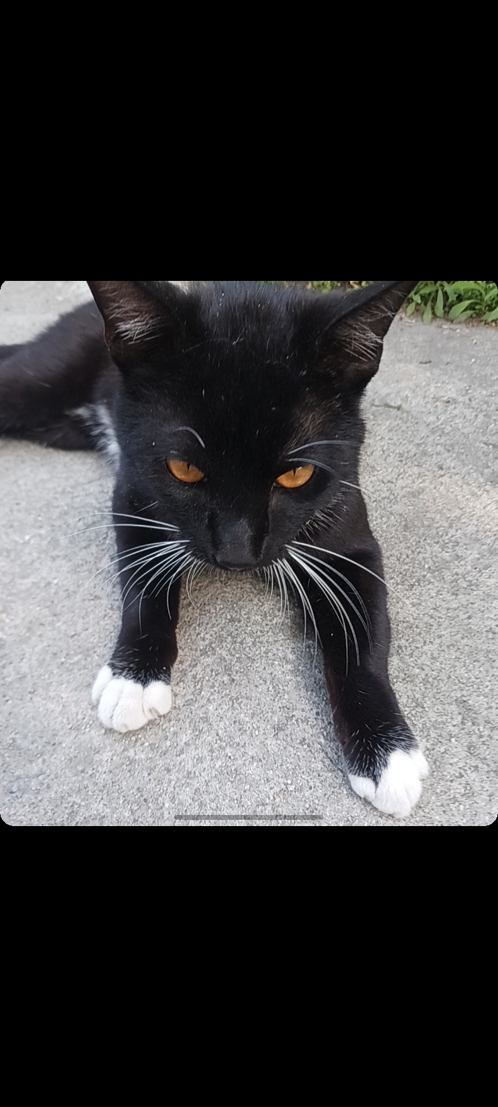Pet Description:He's wearing a worn down GLITTERY BLUE collar. Has mixed bean/paw colors. Is fairly heavy. |