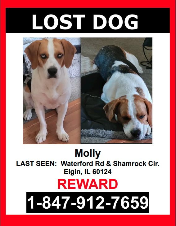 Pet Description:**MISSING SINCE 10/09/24 AT 8:30PM**Molly is a Female, Tricolored Brown,white & black /Brown ears and around eyes with white stripe down middle of face and around snoot with black nose and around nose., Beagle Mixed who escaped and was last seen near Shamrock Cir & Waterford Rd, Elgin, IL 60124.Moly is wearing HER PinkCOLLAR with tags and IS microchipped.If you see Molly please DO NOT CHASE HER.PLEASE CALL OR TEXT ONLY.1 847-912-7659$$ Reward $$ |
