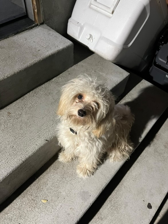 Pet Description:Pink collar, white fur, coat is very grown out, dog is playful |