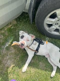 Pet Description:He's overly friendly and will literally go to anyone he sees. He's got a grey circle around his right eye and is all white. He also has on his black harness and his tan collar along with a flea collar. |