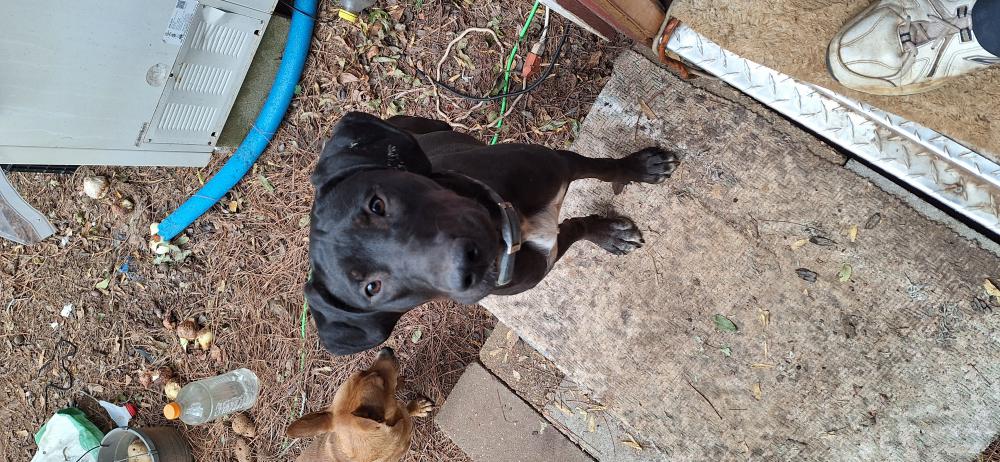 Pet Description:Long legged large black female with blue collar, friendly, very young. |