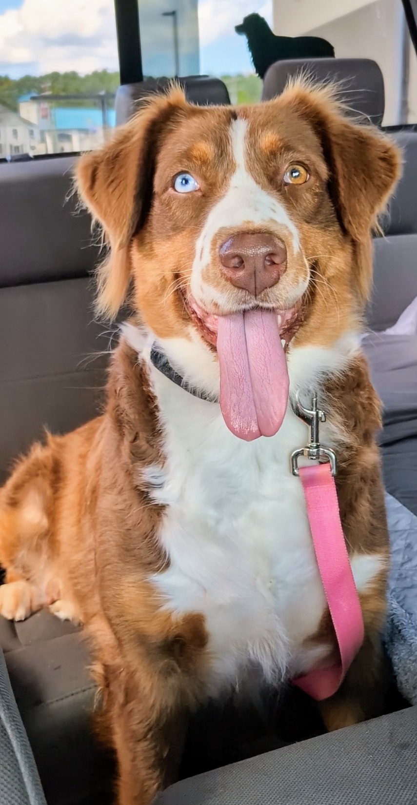 Pet Description:Red w/ tan points. Australian Shepherd. Medium length coat. White markings on face, neck, chest, bobbed tail. 84.4 lbs. Scared & in new home environment. Broke through screen door of new house. |
