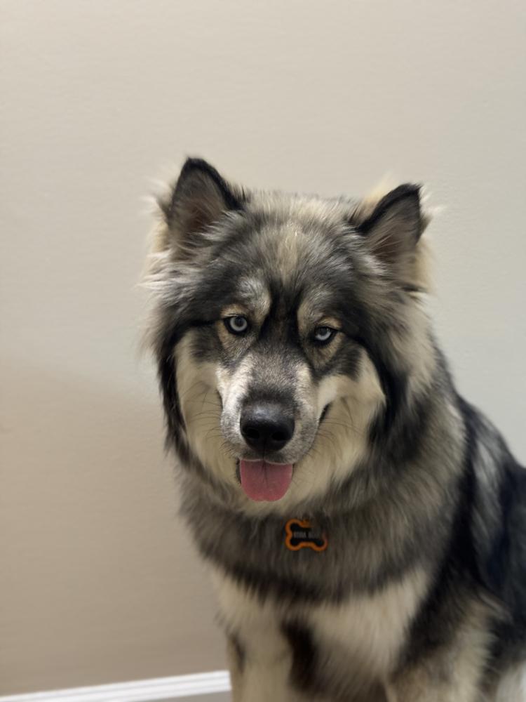 Pet Description:Kodabear is a larger dog, he is fluffy, he is wearing a black harness, he is black/white and has some brown on him, he has blue eyes and one of his eyes have a brown marking. |
