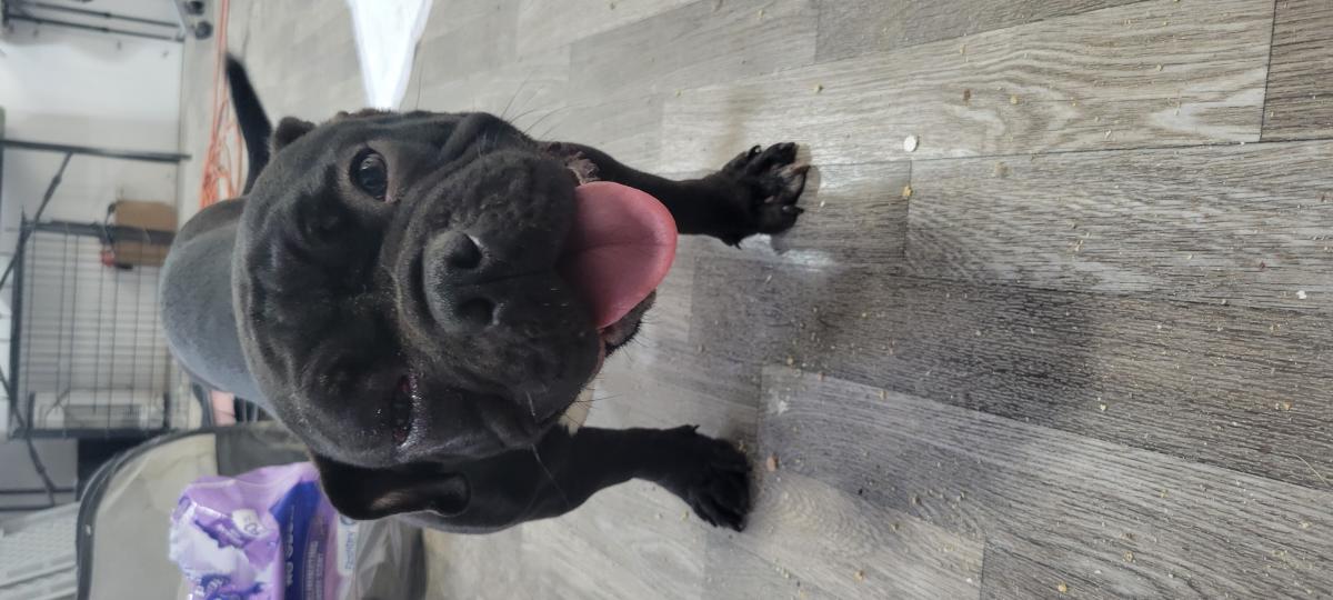 Pet Description:Female Black & some white frenchie or pug or pocket bully mix ? Type |