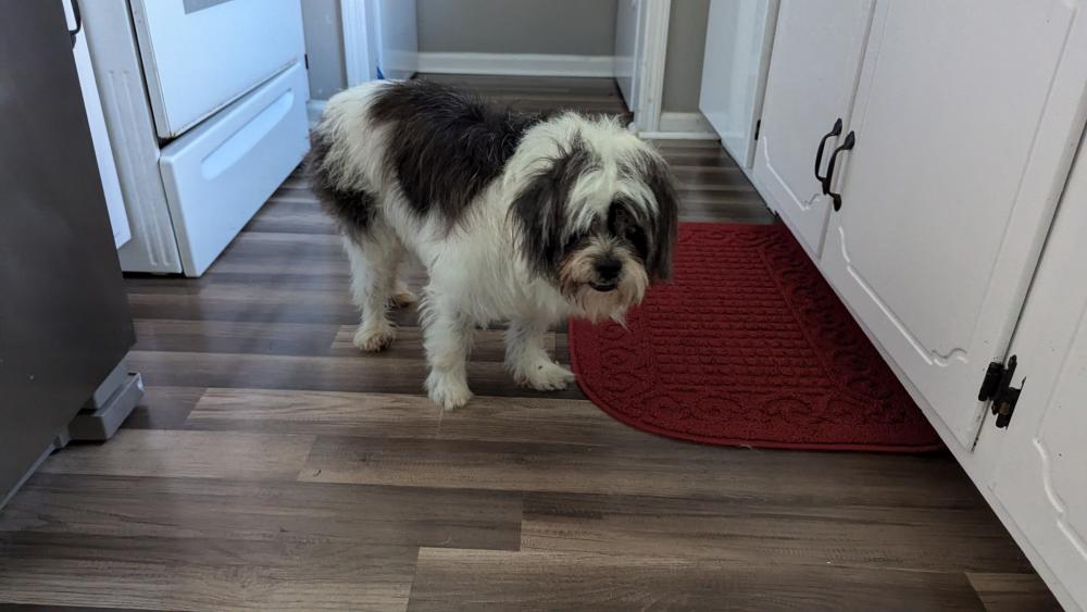 Pet Description:FOUND DOG!!!Was running in the middle of White Bluff Rd, on the double yellow line. If you know whose dog this is please text me!!! My sister in law has him but can only keep him a few days. She's a dog groomer and gave him a bath and trimmed the hair by his eyes. He doesn't look hurt, but he is old and scared. Super sweet. 1 photo from last night and one after the bath |
