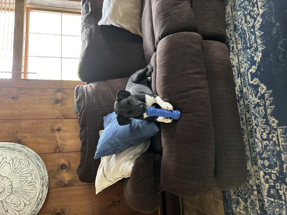 Pet Description:Black with white front paws, 15 lbs, wearing black harness with bone shaped name tag |