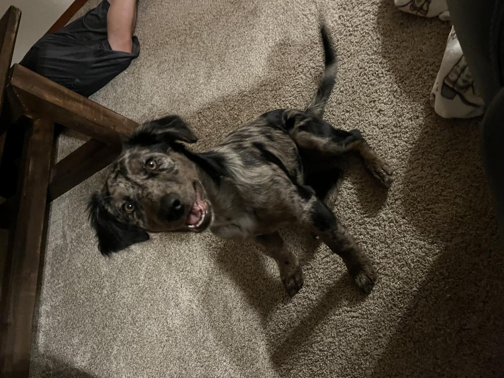 Pet Description:Grey and black spotted. No chip no collar. Very sweet puppy. Approx 4-5 months I think. |