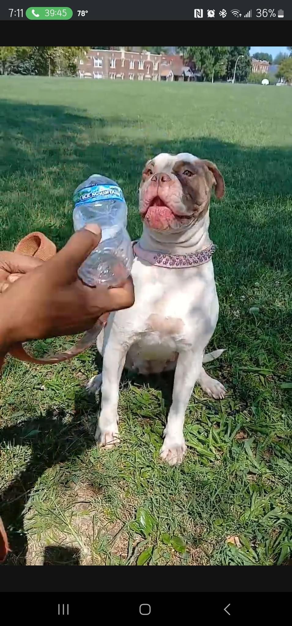 Pet Description:White with brown spots, wearing a pink bandana around her neck! |