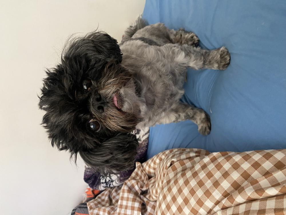 Pet Description:13 lb white, grey and black shih tzu. Shaved body with longer ears. |