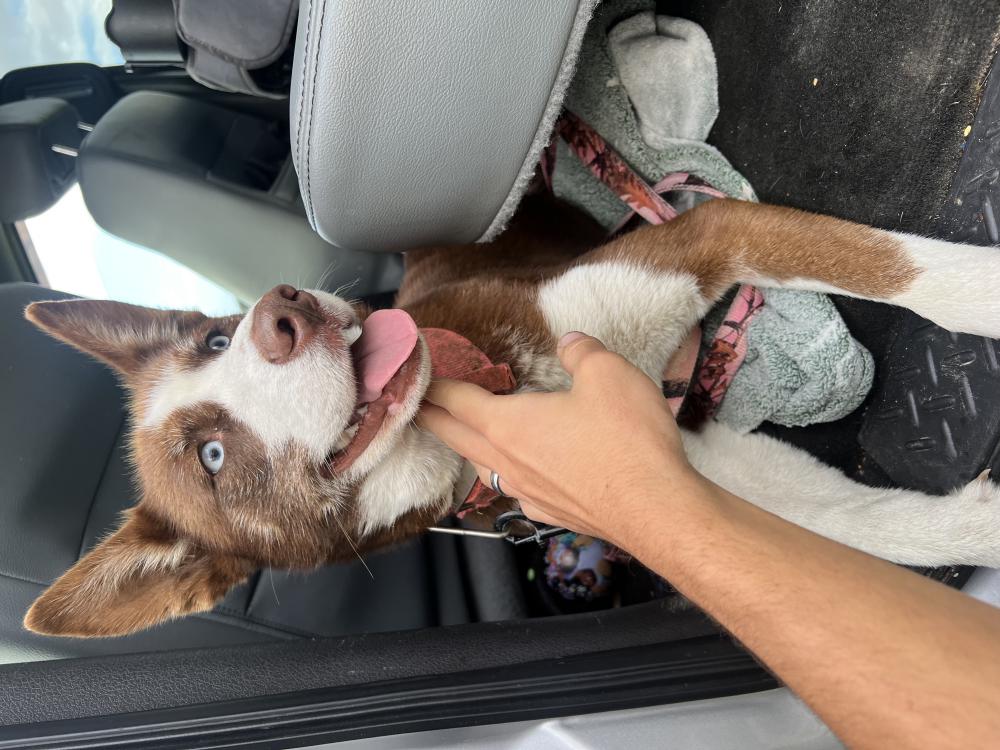 Pet Description:Brown and white tip of tail white like it’s been dipped. Listens pretty well. Possibly older not sure. Very good with kids from what I’ve seen. Thinks she’s a lap dog very cuddly, potty trained. Blue eyes. |