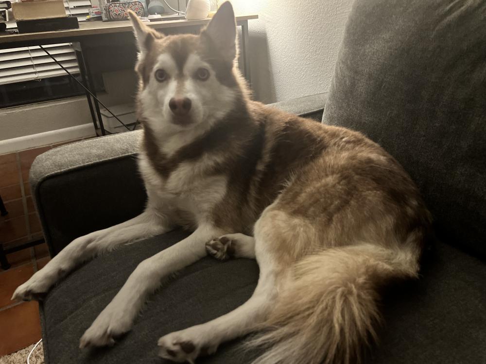 Pet Description:28 pound brown and white Alaskan Klee Kai with blue eyes. Wearing blue harness and leash. Answers to Adonis. |