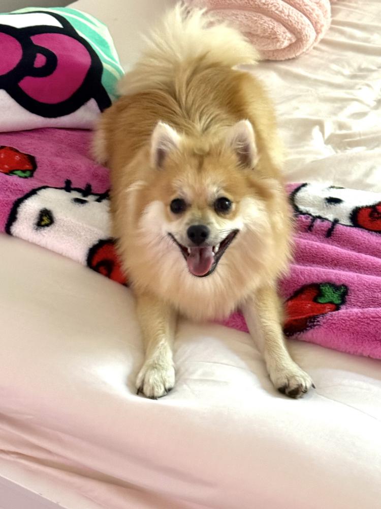 Pet Description:gold pomeranian, small, no collar, and super friendly |
