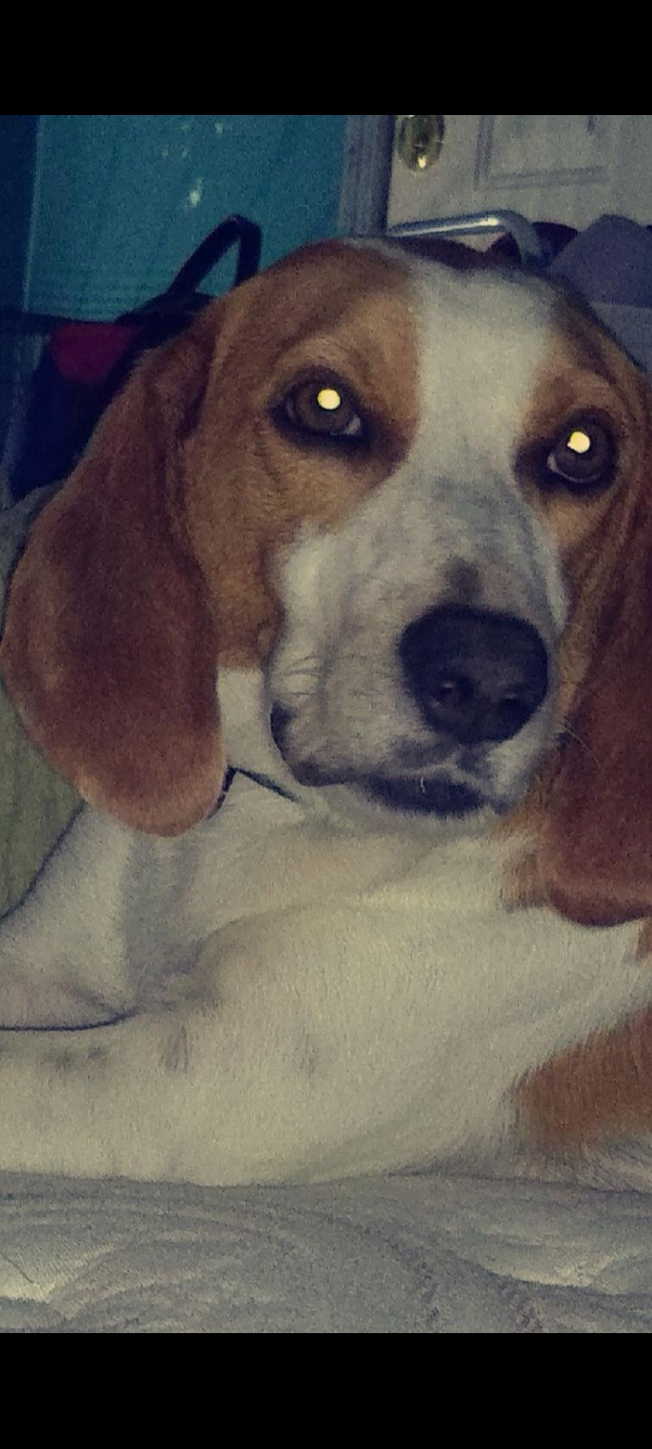 Pet Description:Medium sized beagle with an orange collar brown and white spotted |