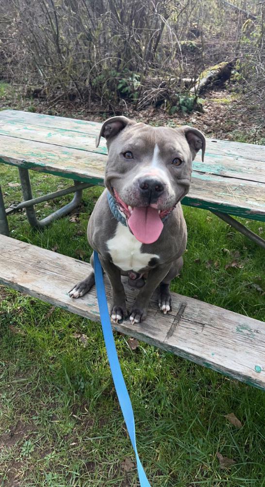 Pet Description:He is around 50lbs grey with white on his face chest and belly. Is very fearful of people. |