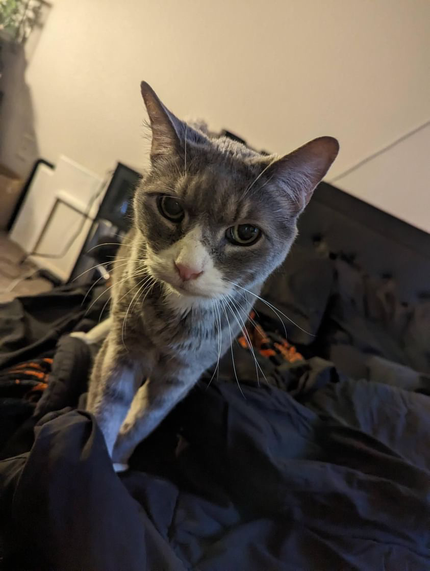 Pet Description:He’s grey with a pink nose and white socks and a scar on the bridge of his nose. He answers to Gibby mostly and he’s old (19) with asthma |