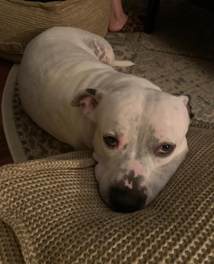 Pet Description:People friendly may not be friendly towards other animals 11 years old may have a week back. She’s all white with some spots and black ear. |