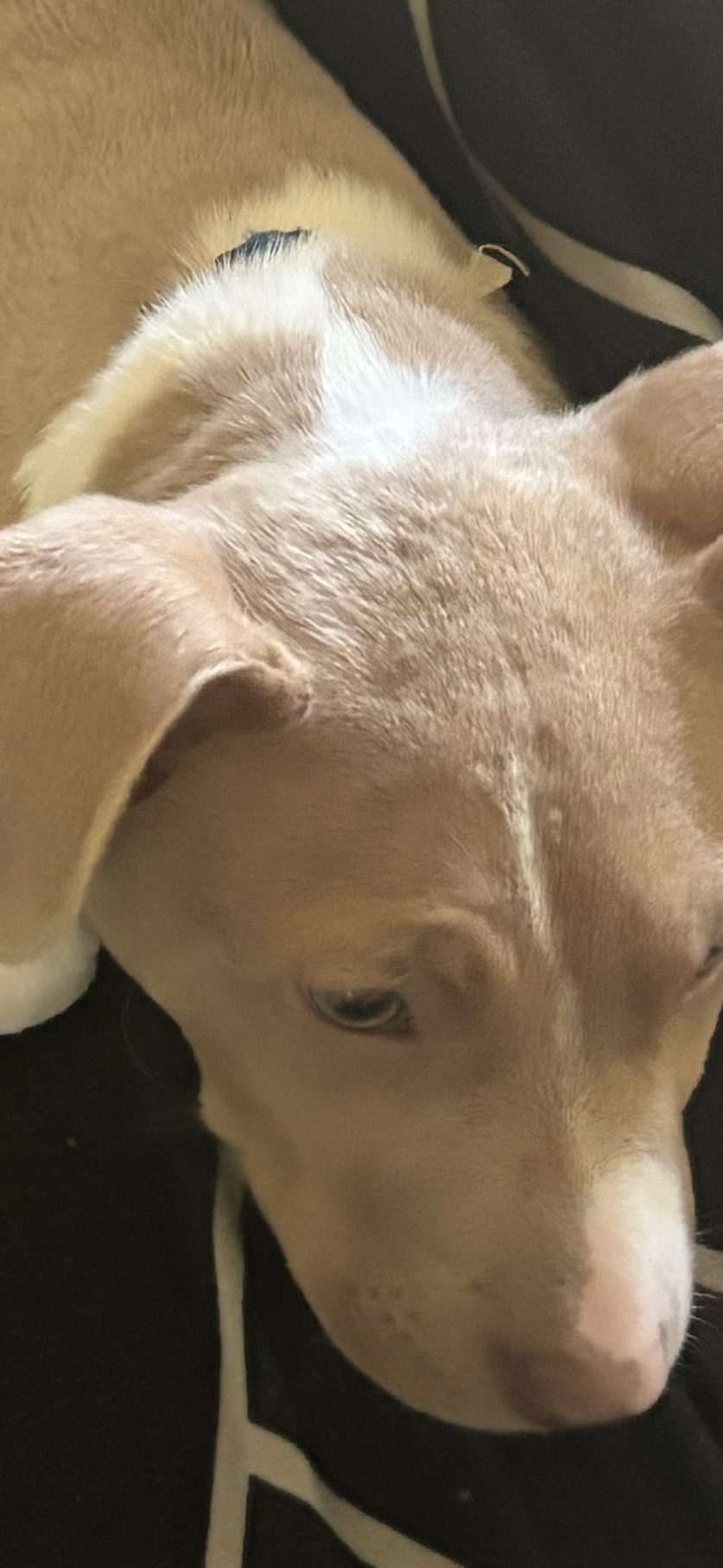 Pet Description:Tan American Pitbull Terrier puppy, blue collar with bones. |
