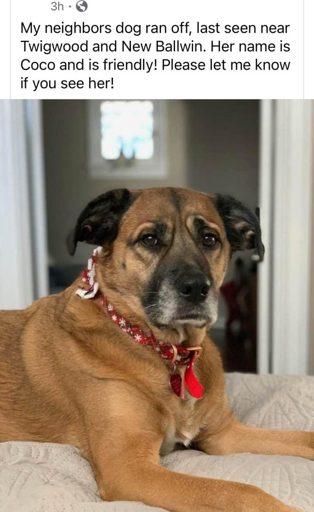 Pet Description:Coco is approximately 70 lbs and 8 years old. She is very sweet but afraid of men and loud noises. She is wearing a pink collar with contact information on it. |