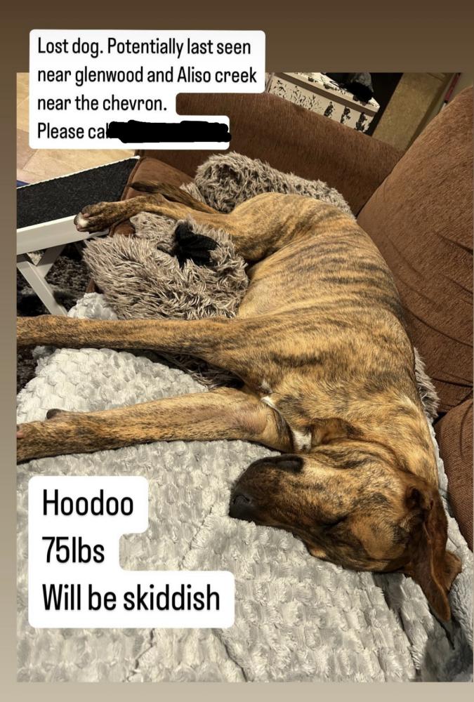 Pet Description:75 lbs, Brown and golden striped mixed husky hound. Will be skittish. |