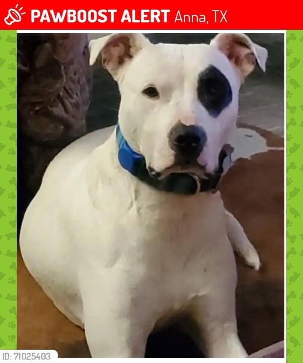 Pet Description:all white only has black on his eye. Has a collar you can scan to contact |