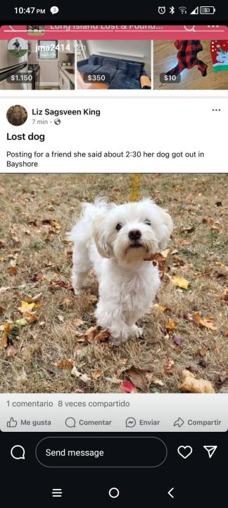 Pet Description:Maltese white brown nose broken left leg |