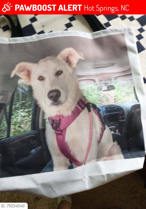 Pet Description:Around 80-85 pounds. Wearing a pink, flowery collar. Leash still attached.After a car accident with a deer on the Hot Springs side of Marshall, she bolted from the car and ran up the mountain to the left (when heading south towards Marshall). |
