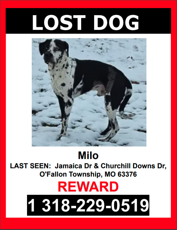 Pet Description:**MISSING SINCE 12/03/24 AT 3 PM**Milo is a Male, Black and white, Mix Labrodor Retriever who escaped and was last seen near Jamaica Dr & Churchill Downs Dr, O'Fallon Township, MO 63376.Milo is NOT WEARING HIS COLLAR and NOT microchipped.If you see Milo please DO NOT CHASE HIM.PLEASE CALL OR TEXT ONLY.1 318-229-0519$$ Reward $$ |