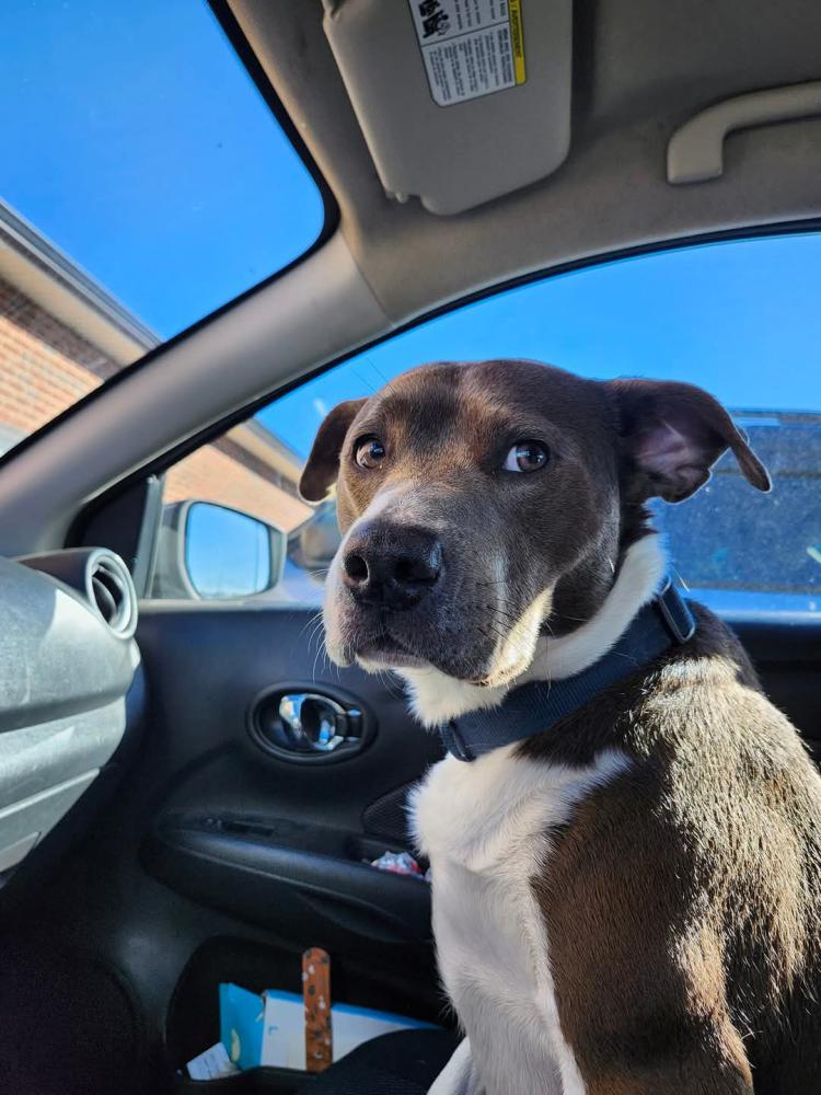 Pet Description:Brownish grey and white. White to right of nose, front legs, belly, tip of tail. May have limp on back left leg. Dark blue collar |