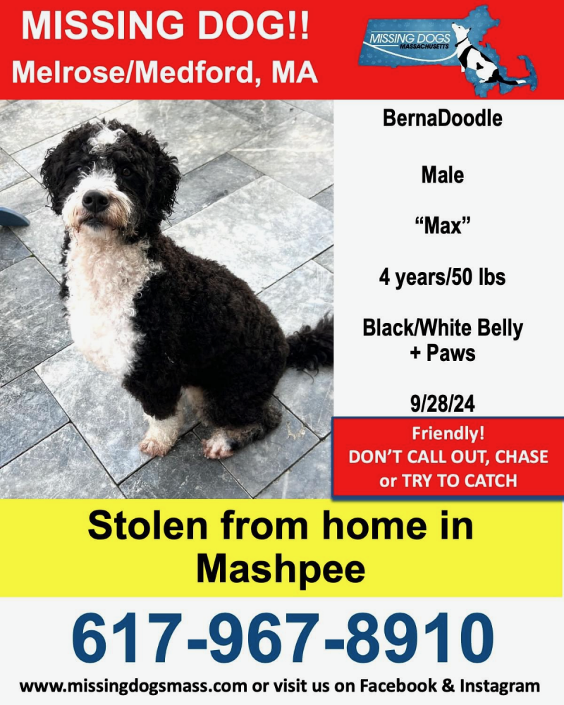 Pet Description:Max is a four year old Berne Doodle. Black with white Belly and white pays that are turning brown. He has brown whiskers. He is 50 pounds. |