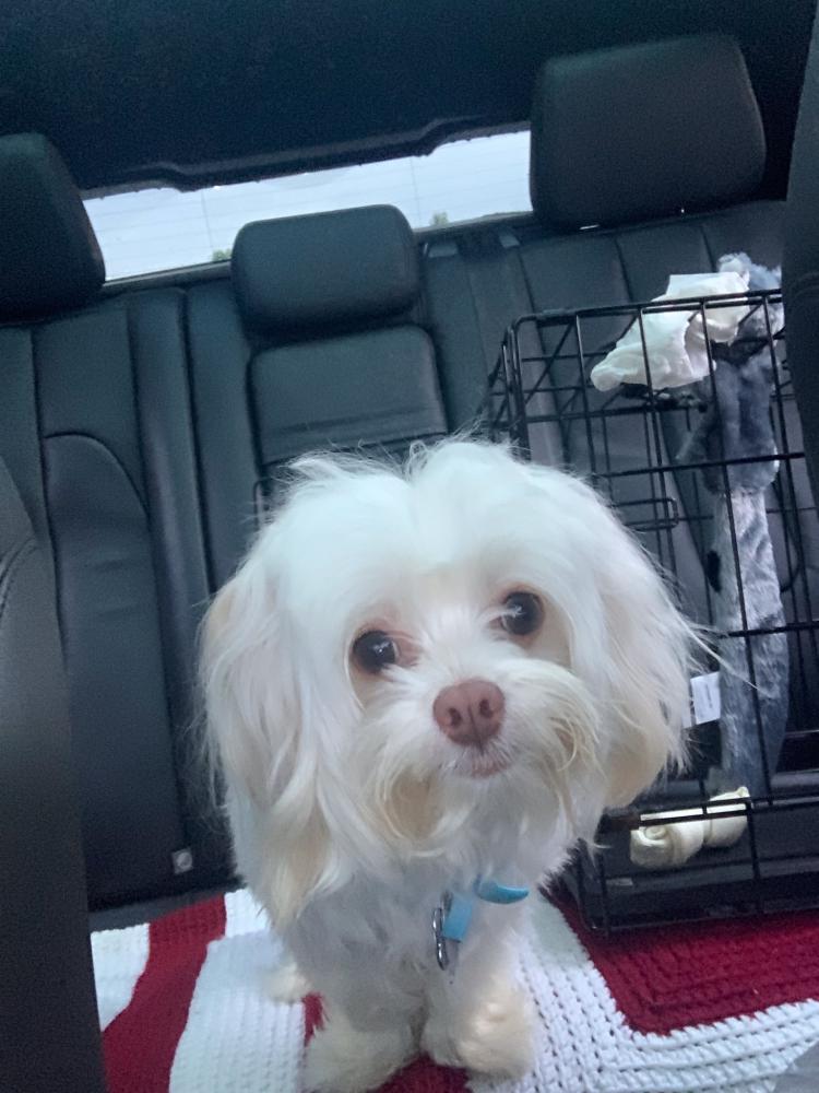 Pet Description:All white short hair, bushy tail, ears and paws, brown stained snout from runny eyes. Will come to you and roll over on his back to be played with answers to Buddy. Does not have his collar on. |
