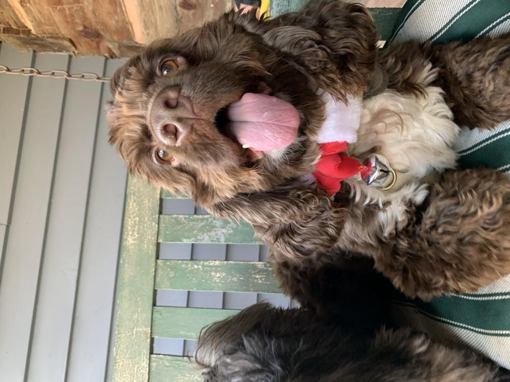 Pet Description:He has a blue harness with a tag of address and number very friendly |
