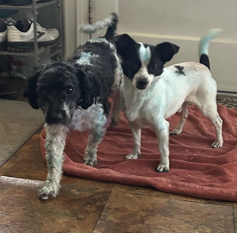 Pet Description:Found with other dog - female. Mixed with Jack Russel, part white/black face, black ears, brown eyes, short legs, about 11 lbs. recently painted with dog due - blue, purple, & pink. |