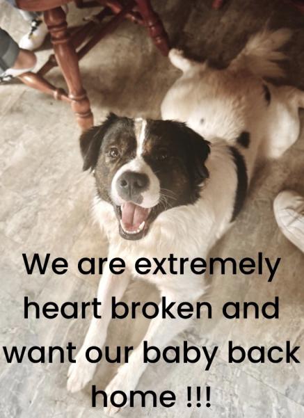 Pet Description:He is all white with Some black spots and has a black box face with a white stripe down the middle of his face . He has medium to long fur and has a Kong collar on. |