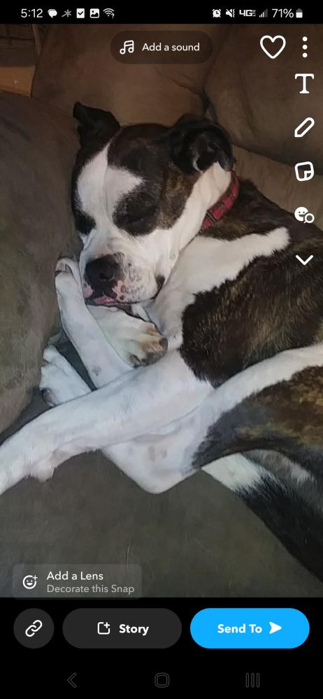 Pet Description:Pit bull boxer mix ..white black and brown ...around the eyes is black and snout is white... big light blue eyes that pop. |