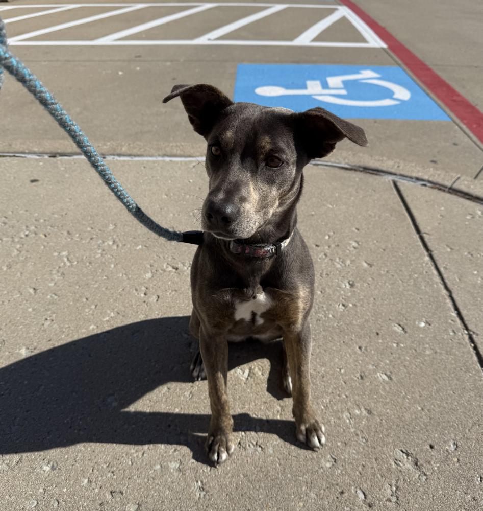 Pet Description:30lb female dog under 1.5 years old. She is grey with a brindle pattern and white underbelly |